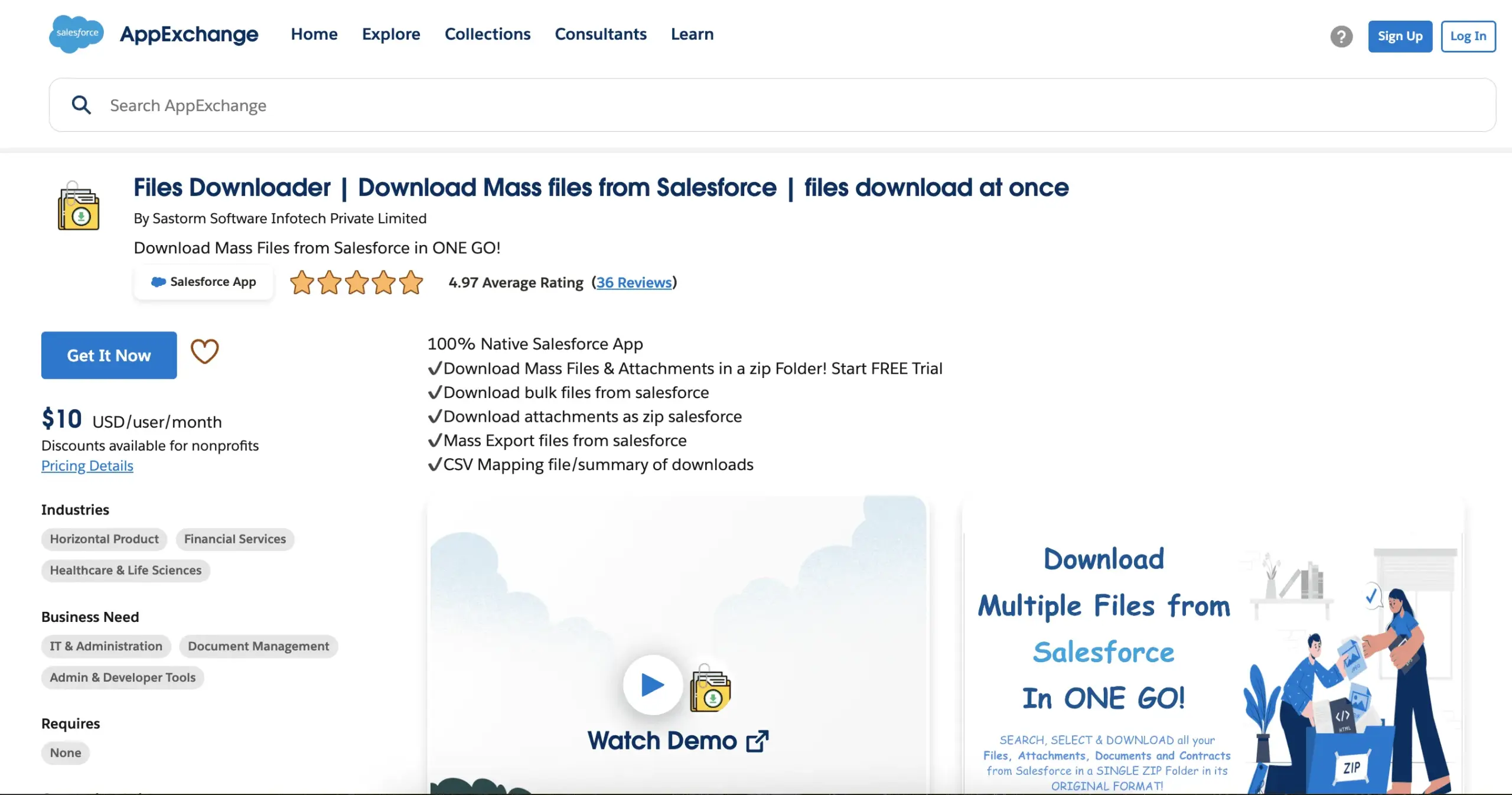 Visit the Salesforce AppExchange and search for Files Downloader.